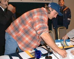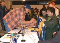 David Ginola was undoubtedly the star of the show. He waved his arms about, threw his hair back, and made the ladies sweat when he took off his chequered over-shirt to reveal his popeye-esque bulging muscles exposed by a white t-shirt. He was so at home for this event, with everyone sitting on the edge of their seat listening intently to every word, every inflexion and pronouncement of what he had to say. He is a genius on the pitch, and a personality that brings great warmth to every room he enters. At the end he stayed a long time, signing autographs and happily posing for photographs. While I chatted to Martin Peters I noticed that Elaine was talking to Ginola. He was leaning over the table and had gently taken hold of her jacket, and was happily explaining that her he was really determined to make sure that the players applauded the fans after the next away game. The look on her face was pure pleasure, to be so close to Ginola, and talking so directly with him. I also got to speak to Ginola at the end, and he really is easy to talk to when your nerves steady down a bit. He really is a wonderful, wonderful guy.