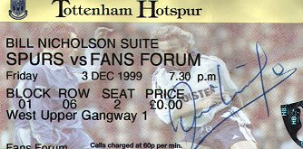 The Fans Forum was, no, is an excellent event, and a brilliant piece of foresight by Martin Peters whose idea it was to stage it. To be in the presence of a legend like Peters, a sub-genius like Pleat and an evolving legend like Ginola was pretty awesome. And to speak to them too! It was a pity Espen didn't get to say more, as I know he us capable of far more, having previously met him and others close to him. Stewart "we've got a problem" Houston certainly showed the right humour to be there, and was a worthy addition to the panel. I for one am already looking forward to the next Fans Forum!